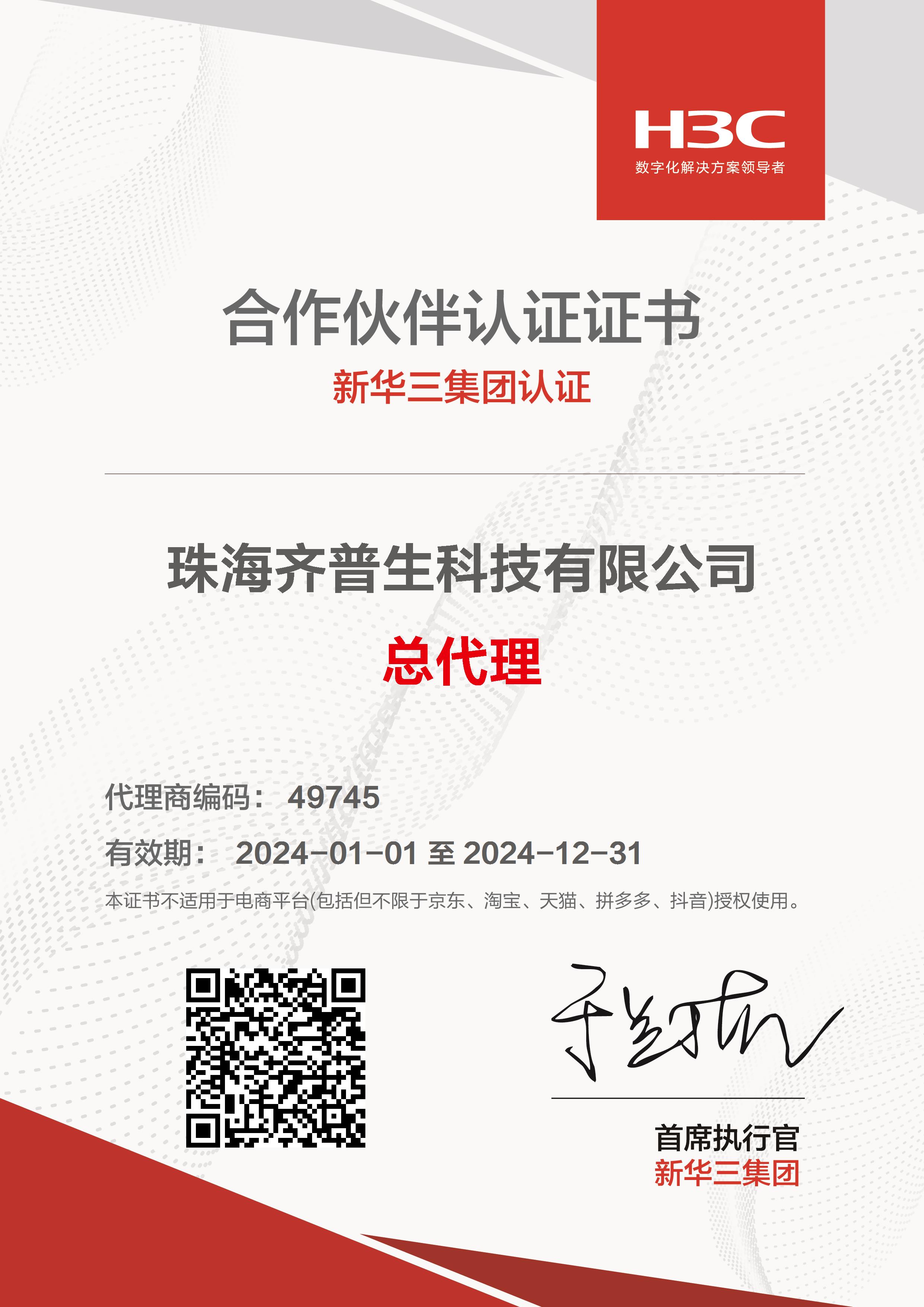 H3C總代證書(珠海公司)